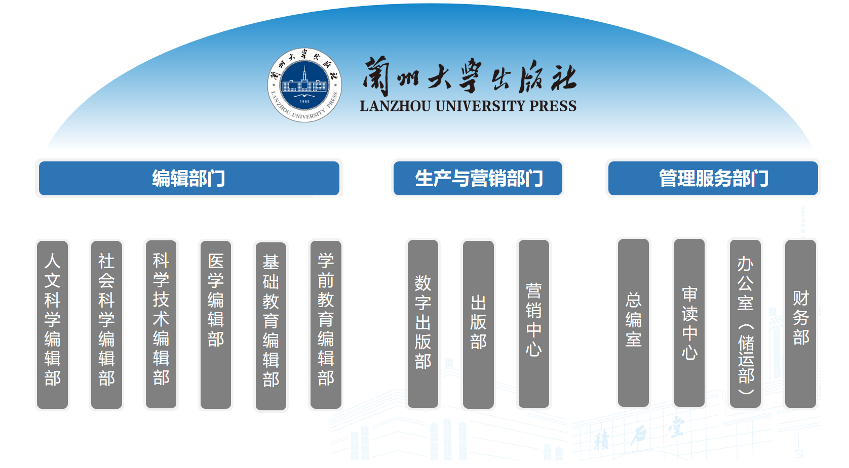 兰州大学出版社设有办公室(储运部)、总编室(审读中心)、人文科学编辑部、社会科学编辑部、科学技术编辑部、医学编辑部、数字出版部、基础教育编辑部、学前教育编辑部、营销中心、出版部、财务部等部门。